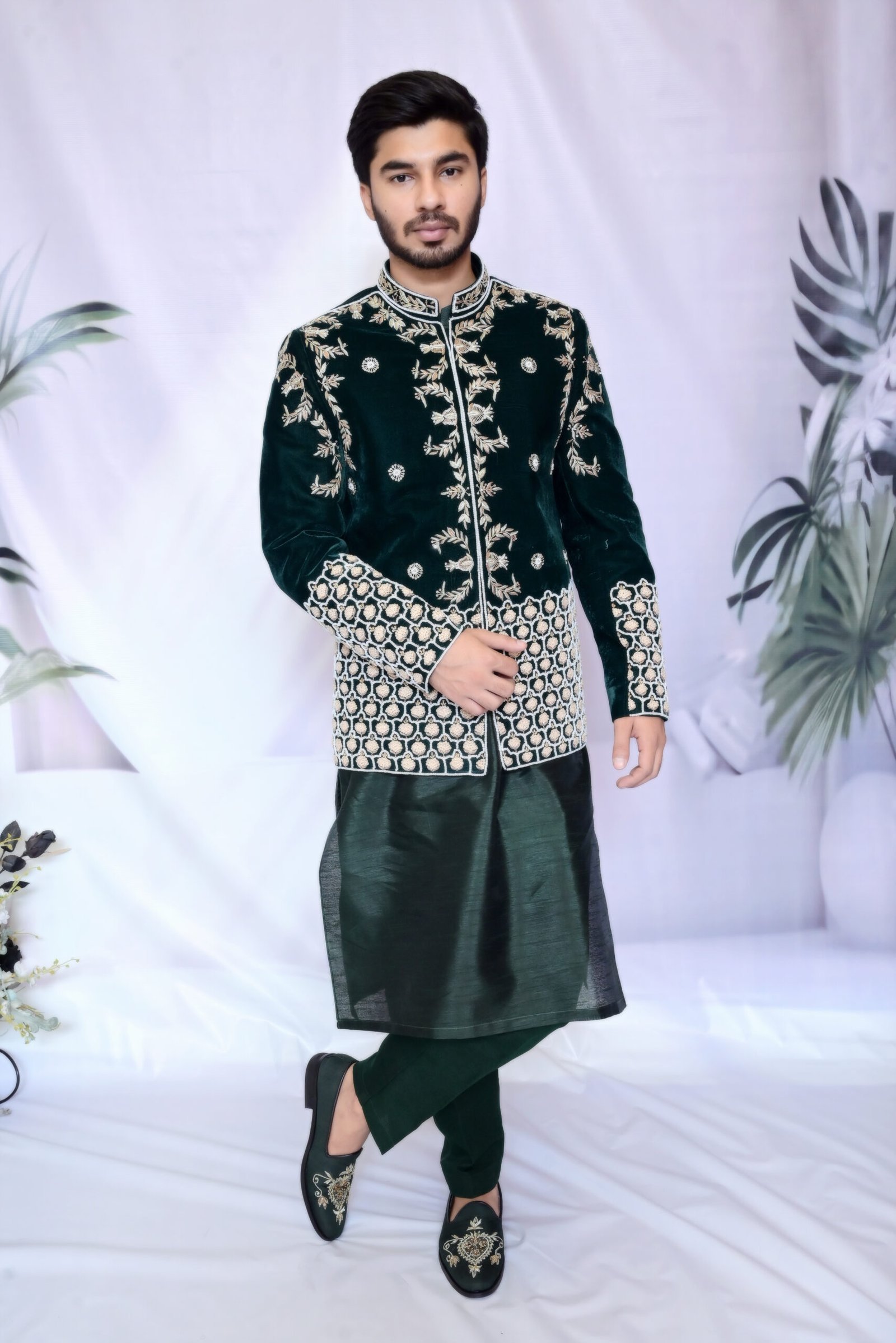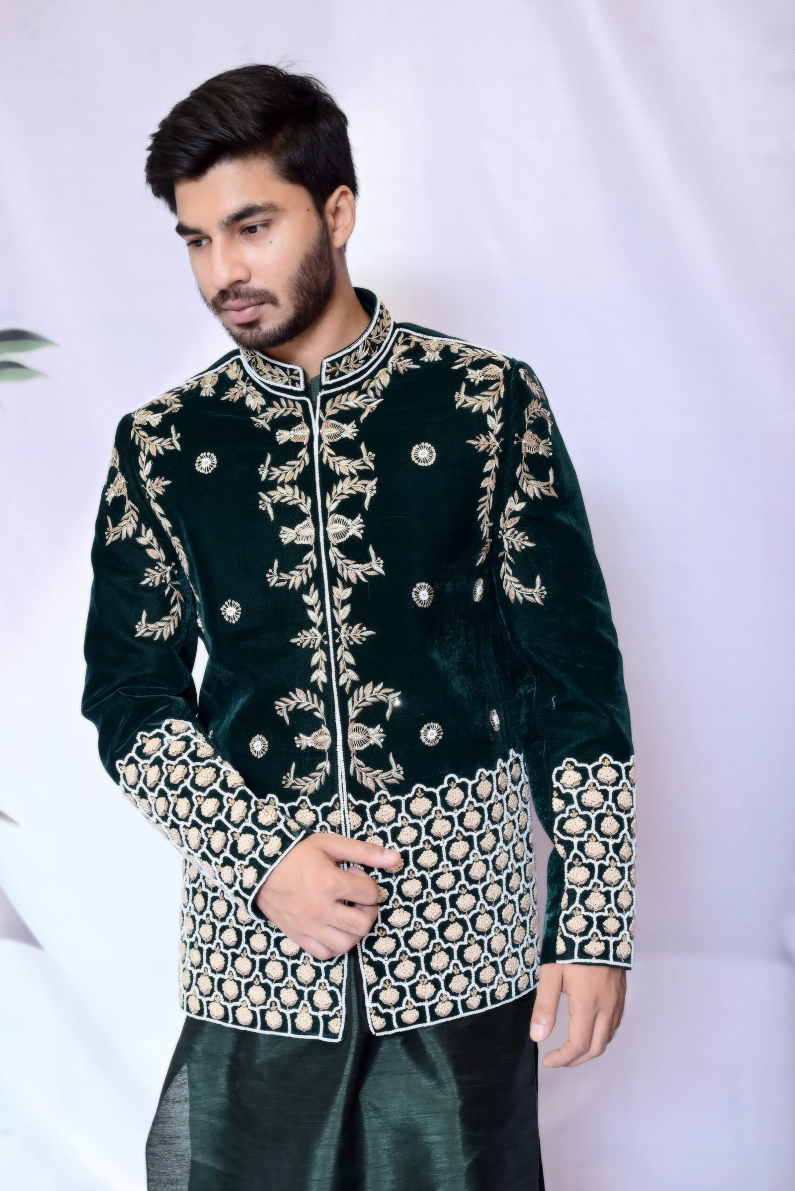 A jacket of distinction. Crafted in plush velvet, this Deep Emerald Prince Coat combines intricate metallic work with a luxurious texture for a truly commanding look.