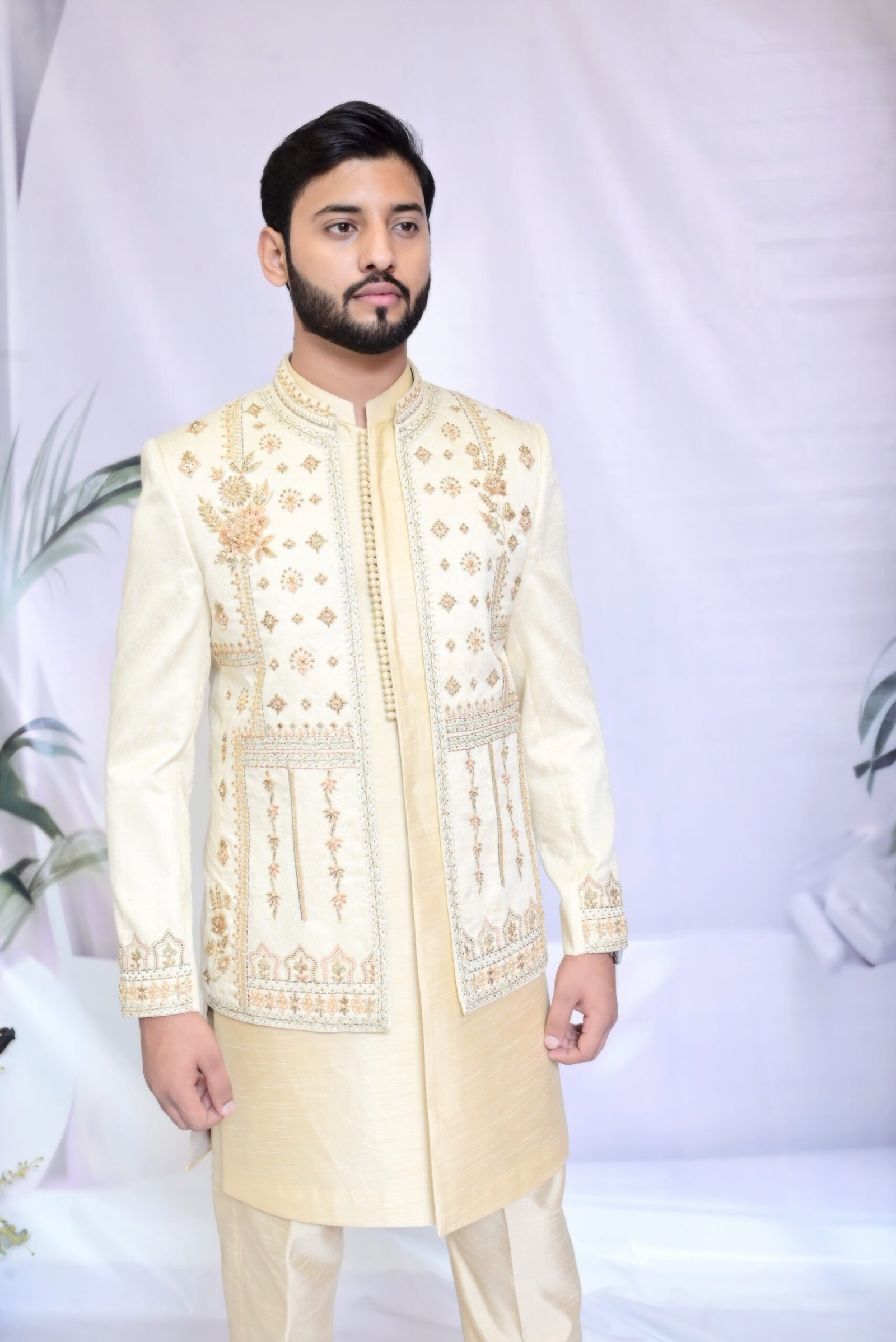The epitome of regal elegance. This Regal Ivory Prince Coat, detailed with delicate metallic embroidery, is crafted for your golden moments.