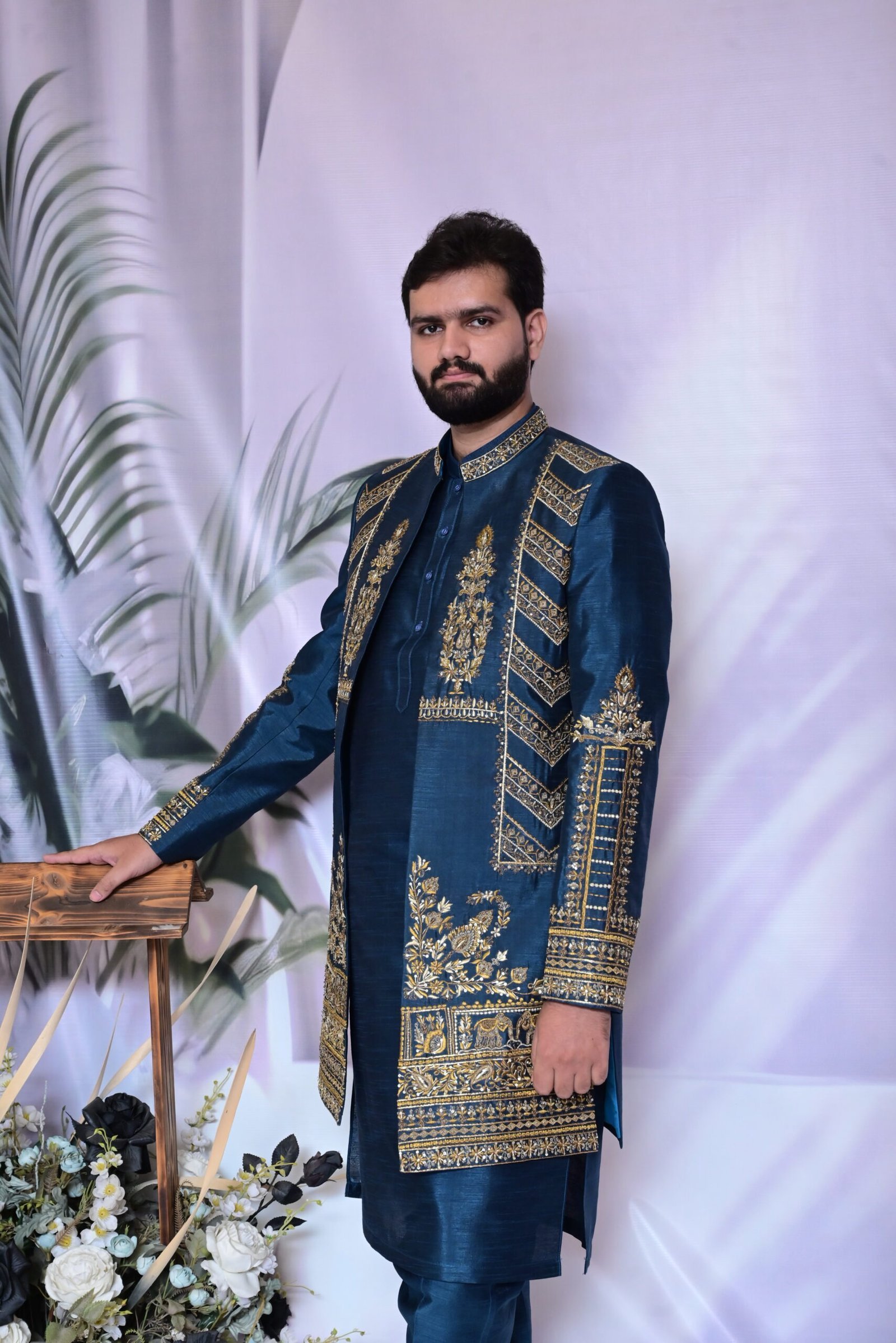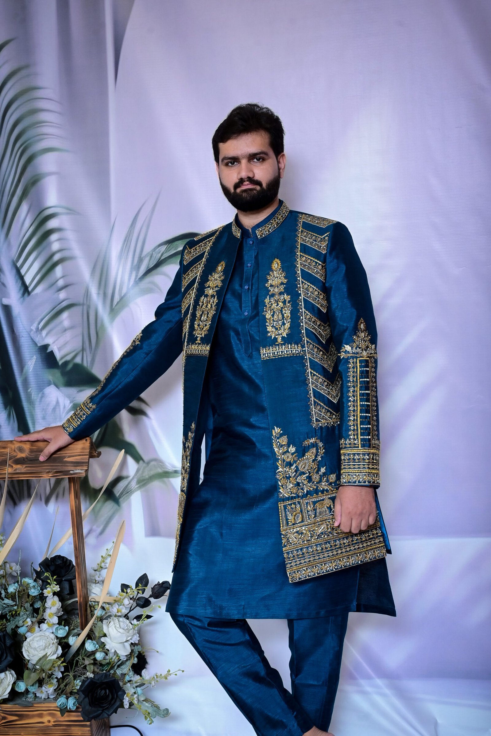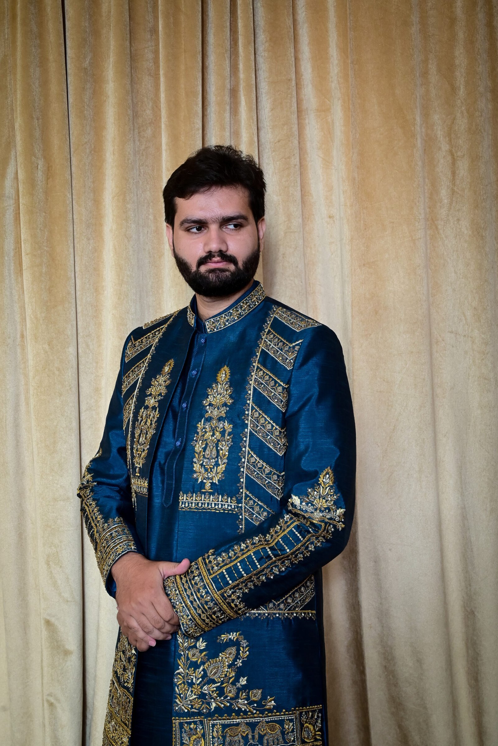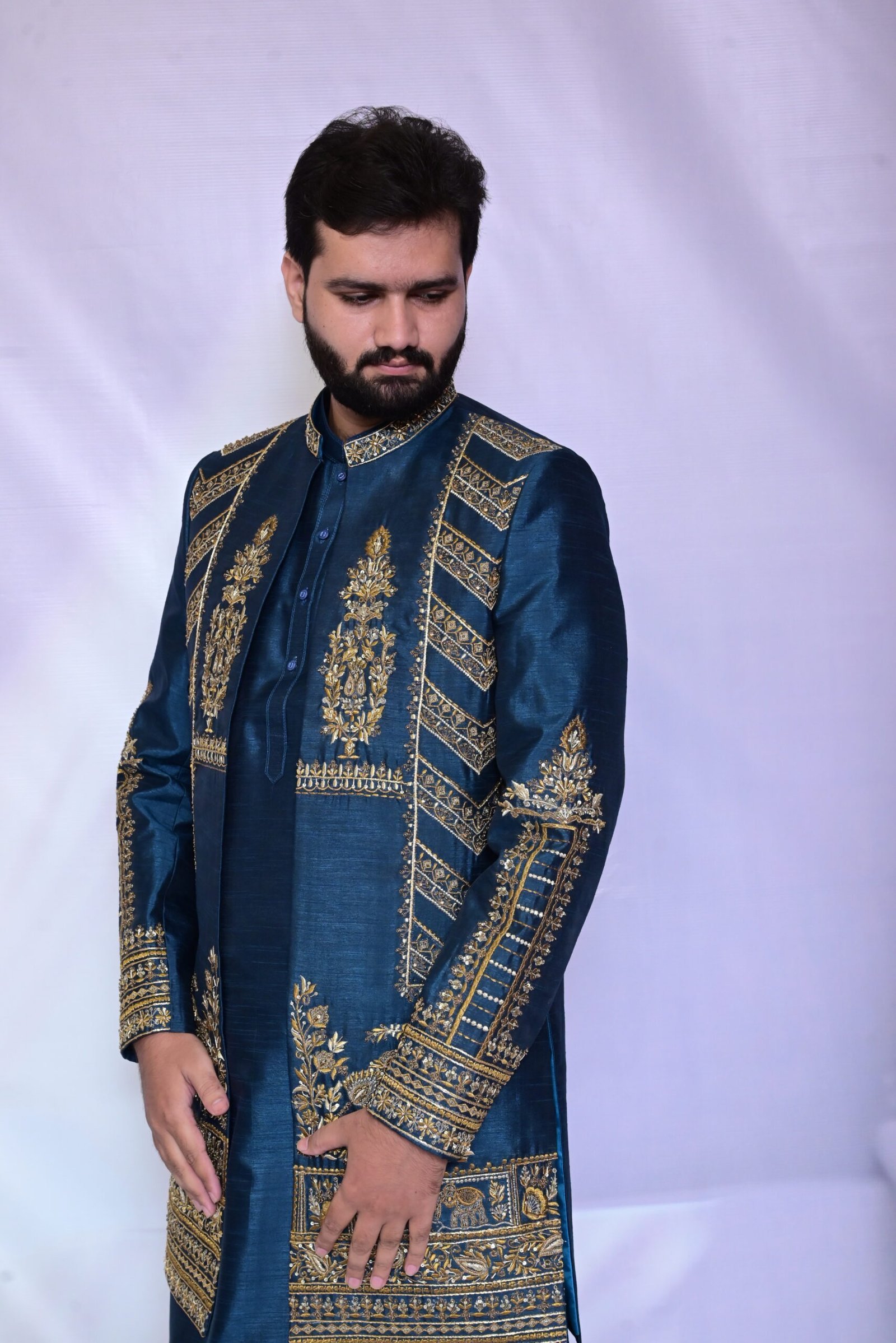 Command the moment. This Imperial Teal Sherwani, adorned with rich gold embellishments, is a testament to timeless elegance and majestic craftsmanship.